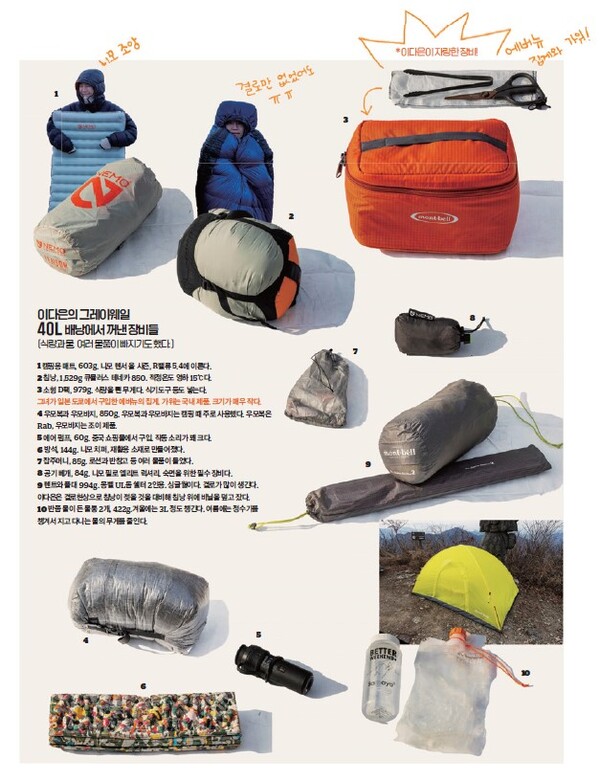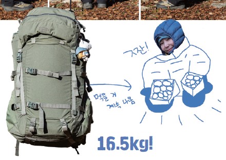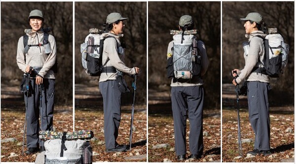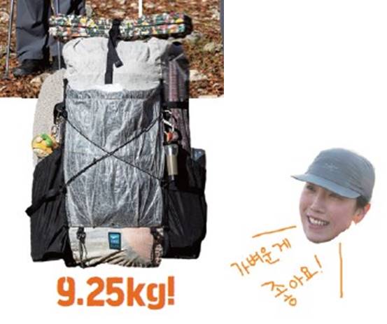 ±×³à°¡ À̹ø¿¡ ¸Þ°í ¿Â ¹è³¶Àº 40L ¿ë·®ÀÌ´Ù. ¡®±×·¹ÀÌ¿þÀϵðÀÚÀΡ¯¿¡¼ ¸¸µé¾ú´Ù. ¹è³¶ °Ñ¸éÀº ¡®´ÙÀ̴ϸ¶¡¯ õÀ¸·Î ¸¸µé¾îÁ³´Ù. °¡º±°í ³»±¸¼ºÀÌ ÁÁ´Ù°í ¾Ë·ÁÁ® ÀÖ´Ù. ¹è³¶ ÀÚü ¹«°Ô´Â 600g Á¤µµ µÈ´Ù. ÀÌ ¹è³¶ ¾È¿¡ ÀÌ´ÙÀºÀÇ µ¿°è¿ë Àåºñ°¡ ¸ðµÎ µé¾î°£´Ù. ±×³àÀÇ ¹è³¶¿¡¼ °¡Àå Å« ¹«°Ô¸¦ Â÷ÁöÇÑ °Ç ¹°°ú ½Ä·®ÀÌ´Ù. 1¹Ú 2ÀÏ ½Ä·®À¸·Î ±×³à´Â ¼Ò½ÃÁö¿Í ¿ÀÆ®¹Ð, ÄŽºÇÁ, ¹ß¿ÆÑ µîÀ» ì°å°í, À̵éÀÇ ¹«°Ô´Â 1kgÀÌ ³Ñ´Â´Ù. ±× ´ÙÀ½ ¹«°Ô°¡ ¸¹ÀÌ ³ª°¡´Â °Ç ħ³¶ÀÌ´Ù. 1.5kg Á¤µµ µÈ´Ù. ±× ¿Ü ÁüµéÀº Æò±Õ 700g Á¤µµ µÆ´Ù. ¹éÆÐÅ·À» ÇÒ ¶§ ¡®Ç³Á·ÇÏ´Ù¡¯´Â ´À³¦À» °ÅÀÇ °®Áö ¸øÇÑ´Ù.