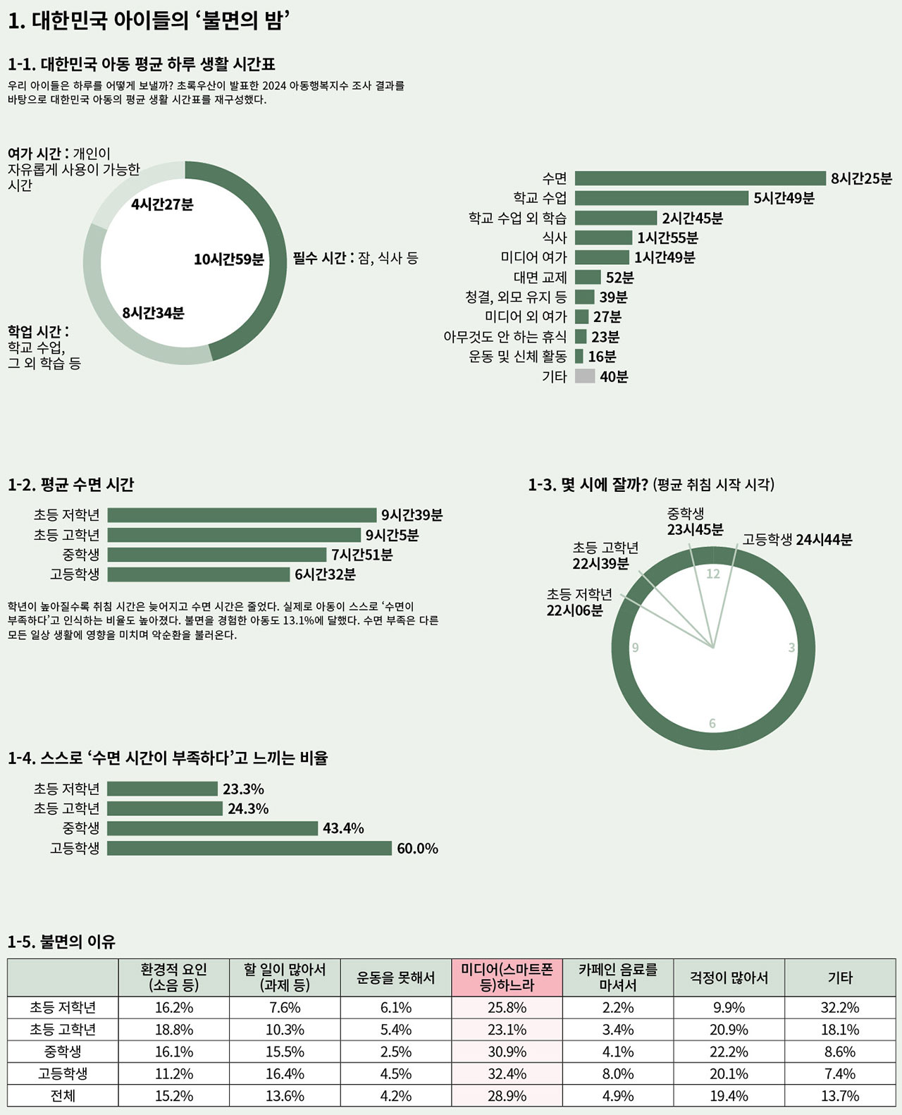 2024³â ´ëÇѹα¹ ¾Æµ¿ÀÇ ÇÏ·ç Æò±Õ ¼ö¸é ½Ã°£Àº 8½Ã°£25ºÐÀ¸·Î, 25%°¡ ¿¬·Éº°·Î ±ÇÀåµÇ´Â ÀûÁ¤ ±âÁغ¸´Ù ºÎÁ·ÇÑ Àá¿¡ ½Ã´Þ¸®°í ÀÖ¾ú´Ù. ½ÉÁö¾î ºÒ¸éÀ» °Þ´Â ¾Æµ¿ÀÌ 13.1%¿¡ ´ÞÇß´Ù. ºÒ¸éÀ» °æÇèÇÑ Áß°í»ý Áß 14.2%°¡ ÀÚÇØ °æÇèÀÌ ÀÖÀ¸¸ç(ºÒ¸é ¾ø´Â Áß°í»ýÀº 3.8%), ºÒ¸éÀ» °æÇèÇÑ Áß°í»ý Áß 24.8%°¡ ÀÚ»ìÀ» »ý°¢ÇÑ ÀûÀÌ ÀÖ´Ù°í ÀÀ´äÇß´Ù(ºÒ¸é ¾ø´Â Áß°í»ýÀº 7.0%). ºÒ¸éÀ» °Þ´Â ¾ÆÀ̵éÀÌ Àá¿¡ ½±°Ô µéÁö ¸øÇÏ´Â °¡Àå Å« ÀÌÀ¯´Â ¡®¹Ìµð¾î¡¯ ¶§¹®(28.9%)À̾ú´Ù. °ú´ÙÇÑ ½º¸¶Æ®Æù »ç¿ë·®°ú ºÎÁ·ÇÑ ÀáÀÌ ¼·Î¸¦ ºÎÃß±â¸ç ¾ÆÀÌÀÇ ÀÏ»ó ¼Ó ±ÕÇüÀ» ±ú¶ß¸®´Â °ÍÀÌ´Ù.