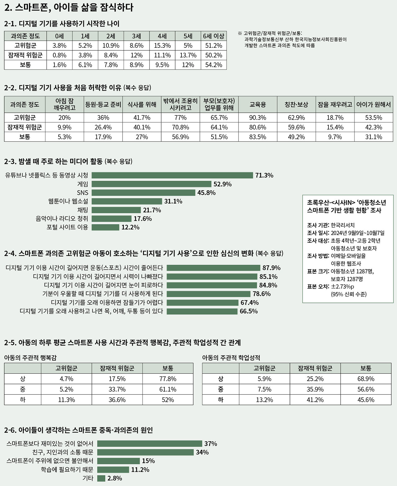 <½Ã»çIN>Àº ÃÊ·Ï¿ì»ê°ú Çù¾÷ÇÏ¿© ¡®¾Æµ¿Ã»¼Ò³â ½º¸¶Æ®Æù ±â¹Ý »ýȰ ÇöȲ Á¶»ç(ÃÊ·Ï¿ì»ê¡¤¡´½Ã»çIN¡µ Á¶»ç)¡¯¸¦ Ãß°¡·Î ½ÉÃþ Á¶»çÇß´Ù. 2024³â 9¿ù ÇÑ ´Þ µ¿¾È ÃÊ4~°í2 Çлý 1287¸í°ú ±× º¸È£ÀÚ°¡ ¼³¹®Á¶»ç¿¡ ÀÀÇß´Ù. ½º¸¶Æ®Æù ÀÌ¿ë ½Ã°£°ú ±× ÀÌÀ¯, ÁÖ·Î Çϴ Ȱµ¿°ú ´õºÒ¾î ½º¸¶Æ®Æù °úÀÇÁ¸À¸·Î ÀÎÇØ ´Þ¶óÁø ½É½ÅÀÇ º¯È µîÀ» ¹°¾ú´Ù.